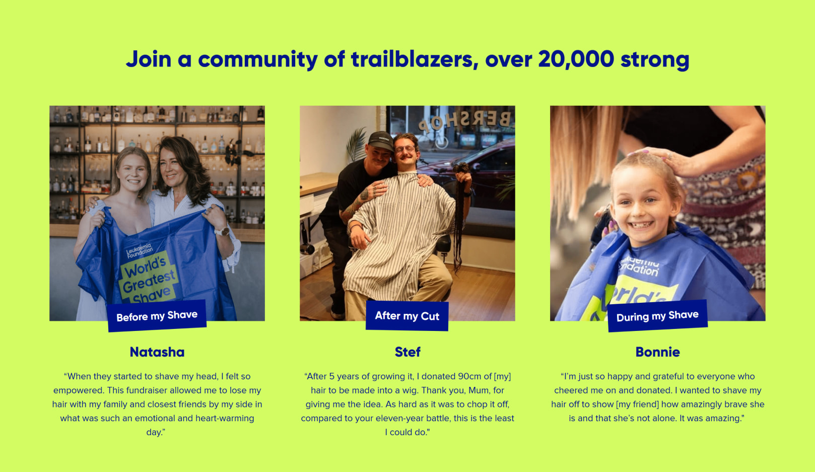 From the moment you land on the homepage, you see real people taking part—shaving, cutting, and colouring their hair. These aren’t stock images; they’re proof that people really do this, and they’re proud of it. That constant presence of other fundraisers normalises the act, replacing fear with familiarity.