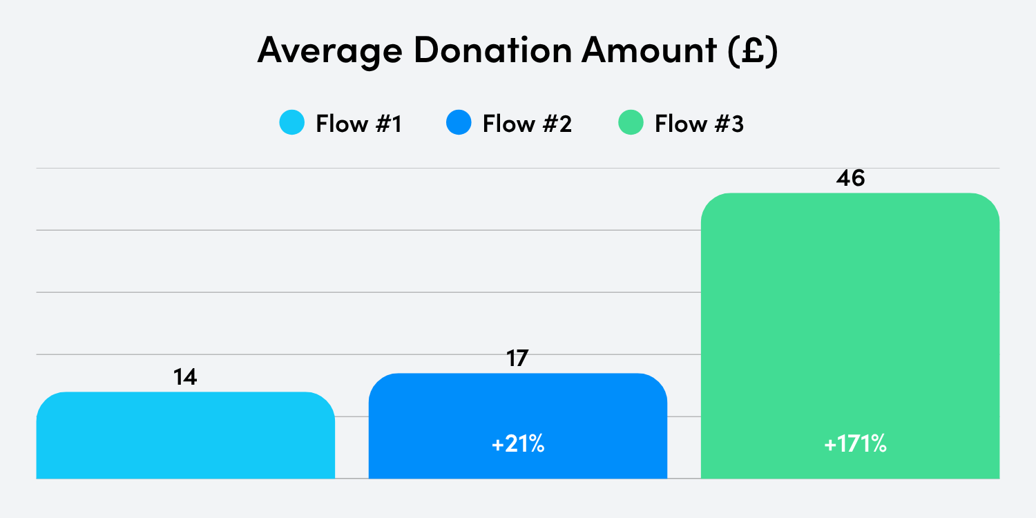 Each donation flow was tested live with a group of 52 UK charity professionals acting as supporters. As we introduced more context, cues, and donor-centred design elements, average donation values increased significantly:
