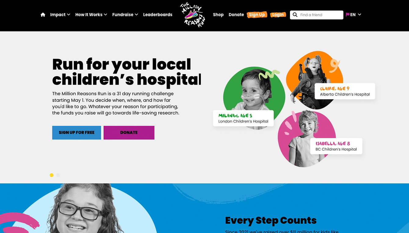 The Million Reasons Run is a virtual, month-long running challenge uniting Canadians in support of life-saving children’s hospital research. Since launching in 2021, it has raised millions of dollars, giving participants the freedom to run anytime, anywhere throughout May.