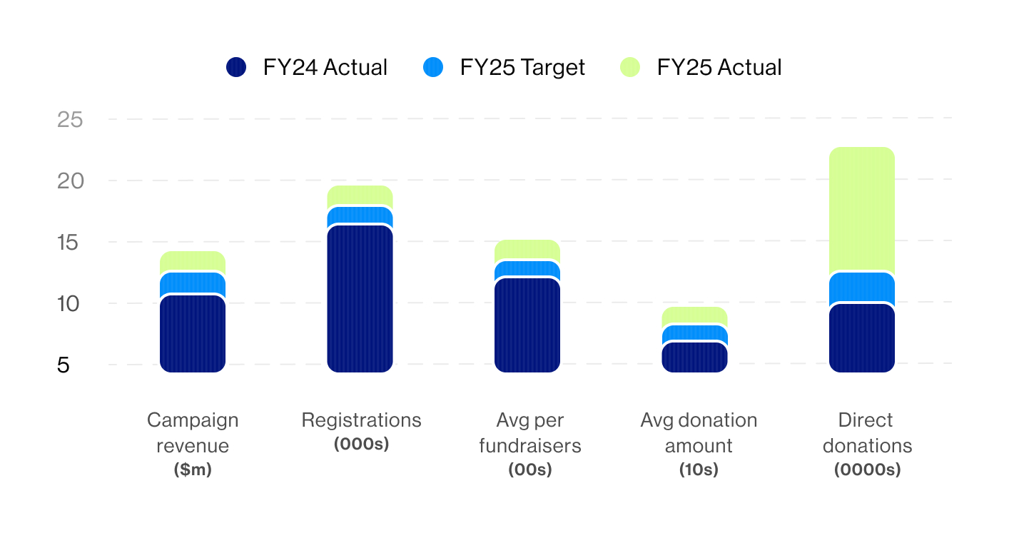 In 2025, World’s Greatest Shave entered a new chapter. In their first year using Funraisin, the campaign delivered a personalized, impact-focused, re-energized supporter journey, and smashed through their key FY25 targets—achieving growth across the board.