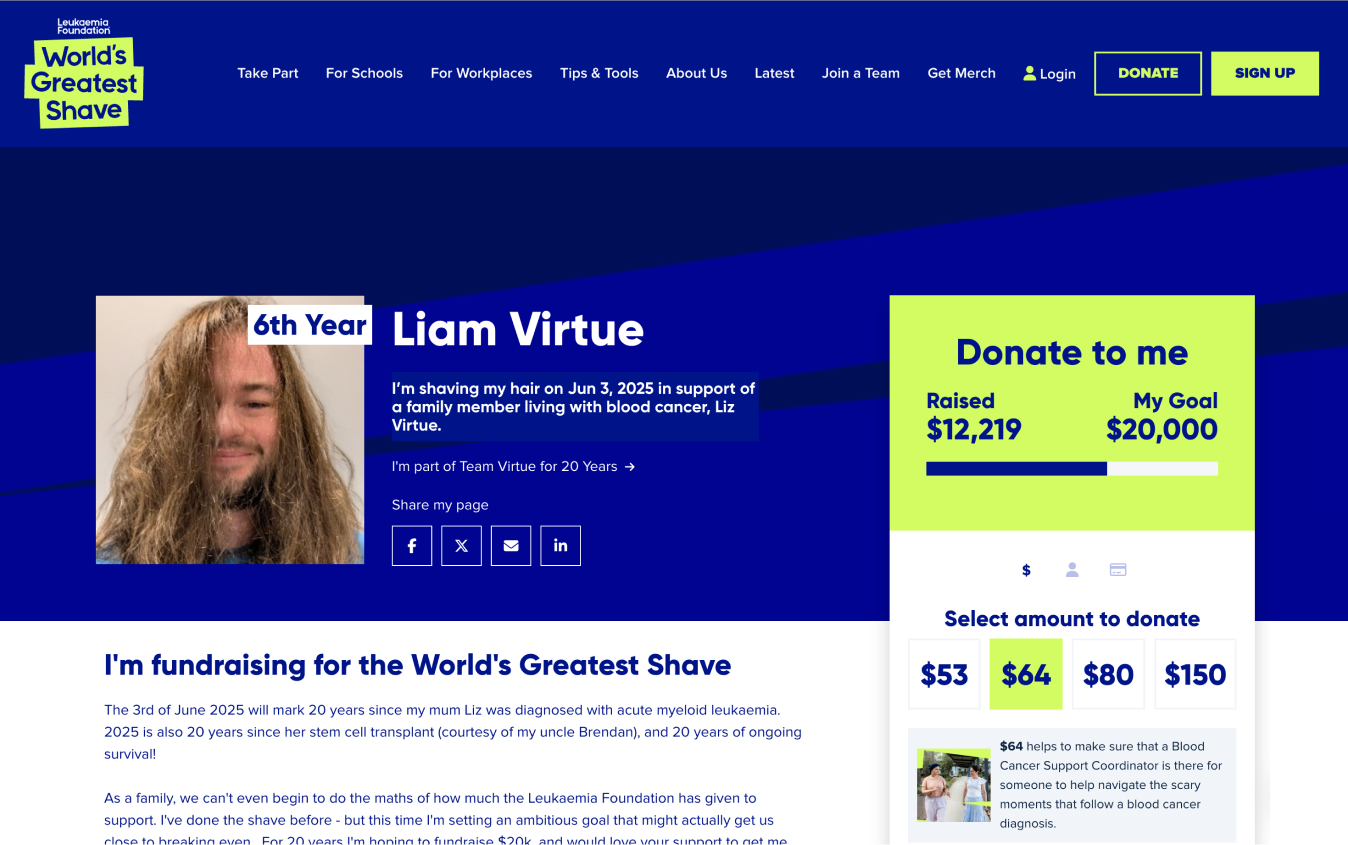 For over 25 years, World’s Greatest Shave has been one of Australia’s most recognized and loved peer-to-peer fundraising events. Run by The Leukaemia Foundation, the campaign invites Australians to shave, cut, or colour their hair in solidarity with families facing blood cancer.